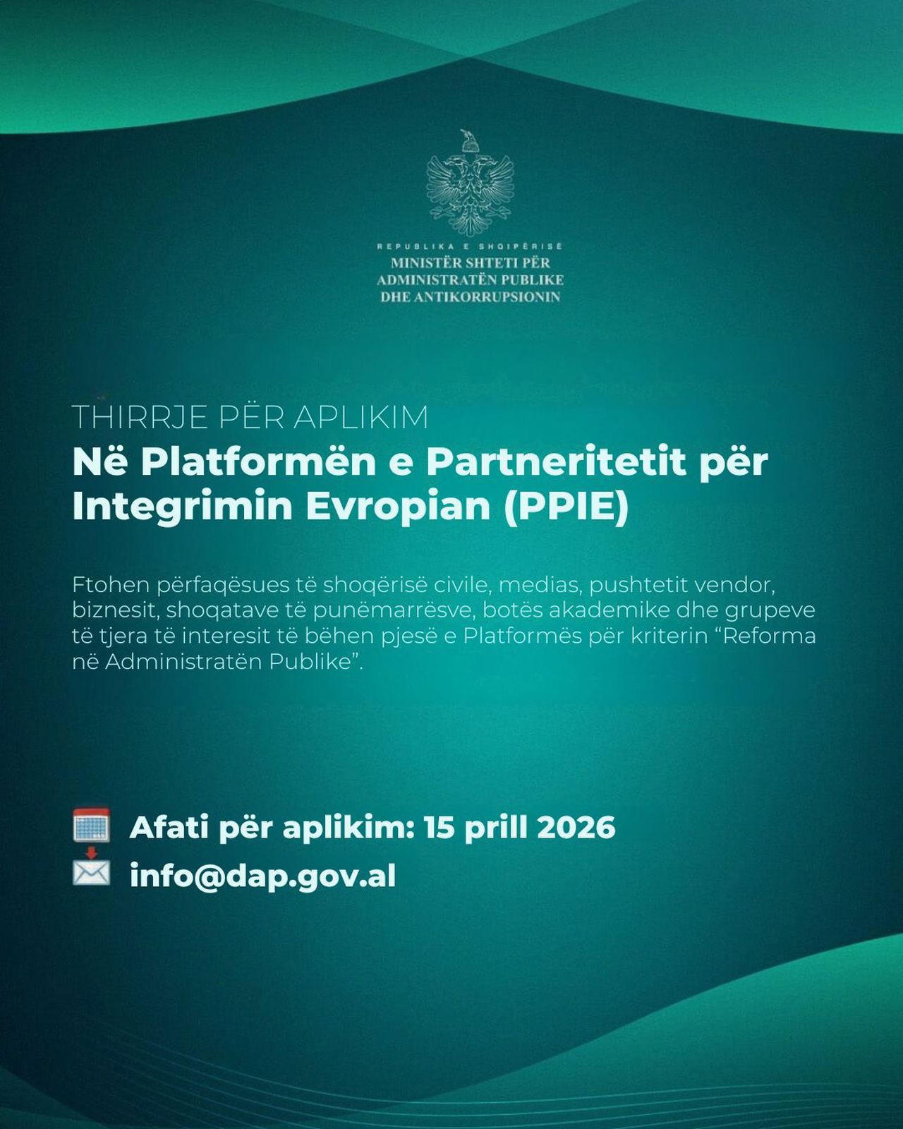 Ministri i Shtetit për Administratën Publike dhe Antikorrupsionin fton të gjithë përfaqësuesit e shoqërisë civile, medias, pushtetit vendor, komunitetit të biznesit, shoqatave të punëmarrësve, botës akademike, qendrave kërkimore dhe grupeve të tjera të interesit, të bëhen pjesë në Platformën e Partneritetit për Integrimin Evropian për Kriterin “Reforma në Administratën Publike”.
