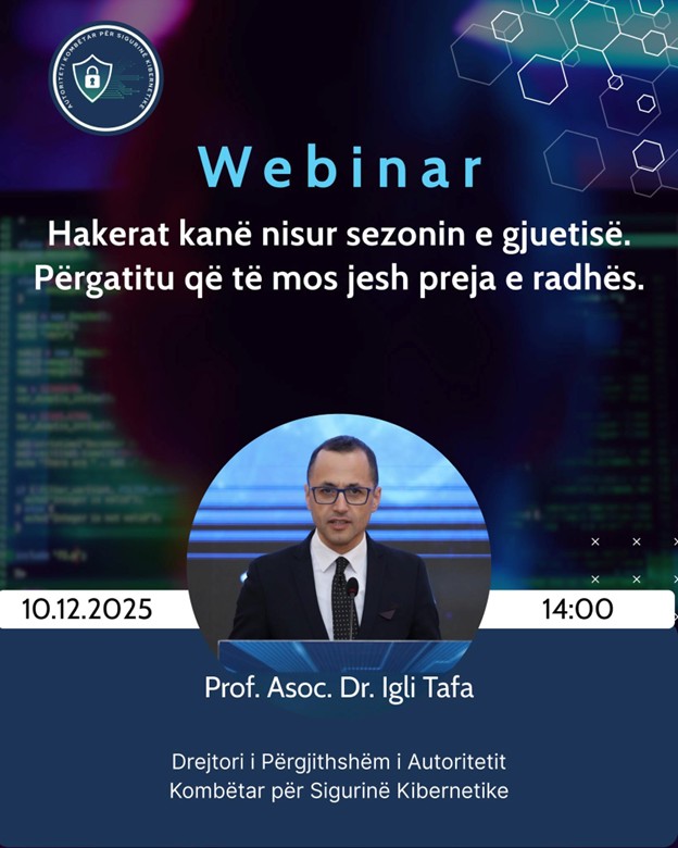 Autoriteti Kombëtar për Sigurinë Kibernetike organizon webinar-in përmbyllës të vitit 2025, të udhëhequr nga Drejtori i Përgjithshëm, z. Igli Tafa, me fokus rritjen e sigurisë digjitale gjatë periudhës së festave, një sezon kur hakerat janë më aktivë dhe sulmet kibernetike shtohen ndjeshëm.